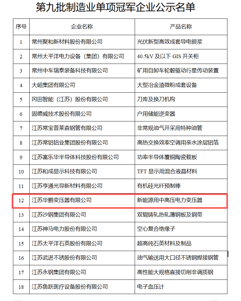 Недавно Департамент промышленности и информационных технологий провинции Цзянсу объявил девятую партию предприятий-лидеров в сфере производства. Компания Jiangsu Huapeng Transformer Co., Ltd. была успешно отобрана за свои «средне- и высоковольтные силовые трансформаторы для применения в сфере новых энергий». Это стало еще одним значительным признанием на национальном уровне в сфере высокотехнологичного производства для компании после того, как ее силовой трансформатор 110 кВ был назван продуктом-лидером в 2021 году. Как эталонное предприятие в трансформаторной промышленности Китая, эта награда подчеркивает его лидирующие позиции в мире в области энергетического оборудования для новых энергий.
